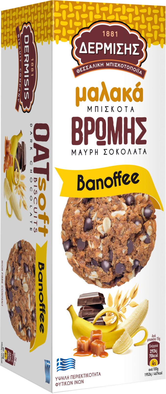 Ingrediente : ovăz 40% ( făină integrală de ovăz , fulgi de ovăz ), bucăți de ciocolată neagră 15% (zahăr, masă de cacao, unt de cacao, dextroză, emulgator: lecitină din soia , arome), uleiuri vegetale (ulei de palmier, ulei de floarea soarelui), zahăr, făină de grâu , sirop de glucoză-fructoză, nucă de cocos, pudră de cacao, masă de caramel 4% (zahăr, sirop de glucoză-fructoză, pudră de smântână integrală , unt ), fructoză, umectant: glicerol; zer pudră , sare, emulgator: lecitină din soia ; agenți de creștere (bicarbonat de sodiu, bicarbonat de amoniu), arome. Poate conține urme de nuci , arahide și semințe de susan .