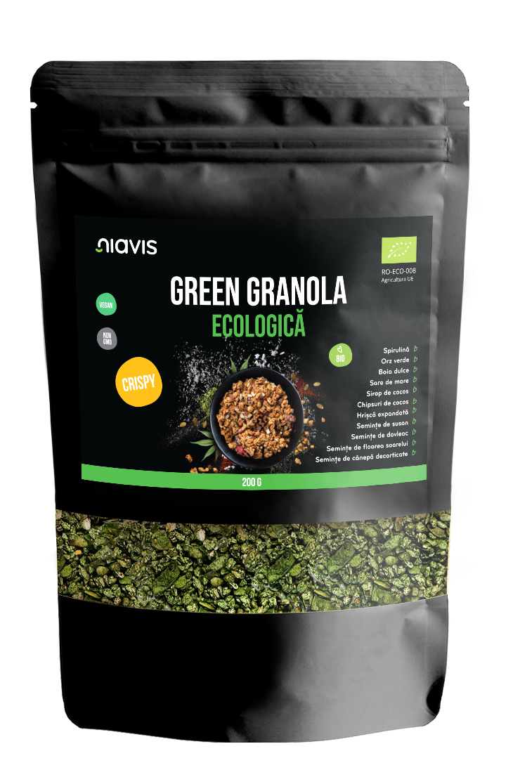 Green Granola Ecologic/Bio de la Niavis este un amestec sănătos și delicios de ingrediente ecologice, conceput pentru a oferi un start excelent dimineților tale sau pentru a servi drept gustare nutritivă în orice moment al zilei. Acest granola este preparat la temperaturi sub 42°C(RAW), menținând astfel cea mai mare valoare nutritivă a ingredientelor. Într-o lume în care opțiunile alimentare sănătoase sunt din ce în ce mai căutate, Green Granola îți aduce un echilibru perfect între gust și beneficii nutriționale. Fiecare ingredient a fost selectat cu grijă pentru a oferi un aport maxim de nutrienți, fibre și antioxidanți, contribuind astfel la o alimentație echilibrată și un stil de viață activ.