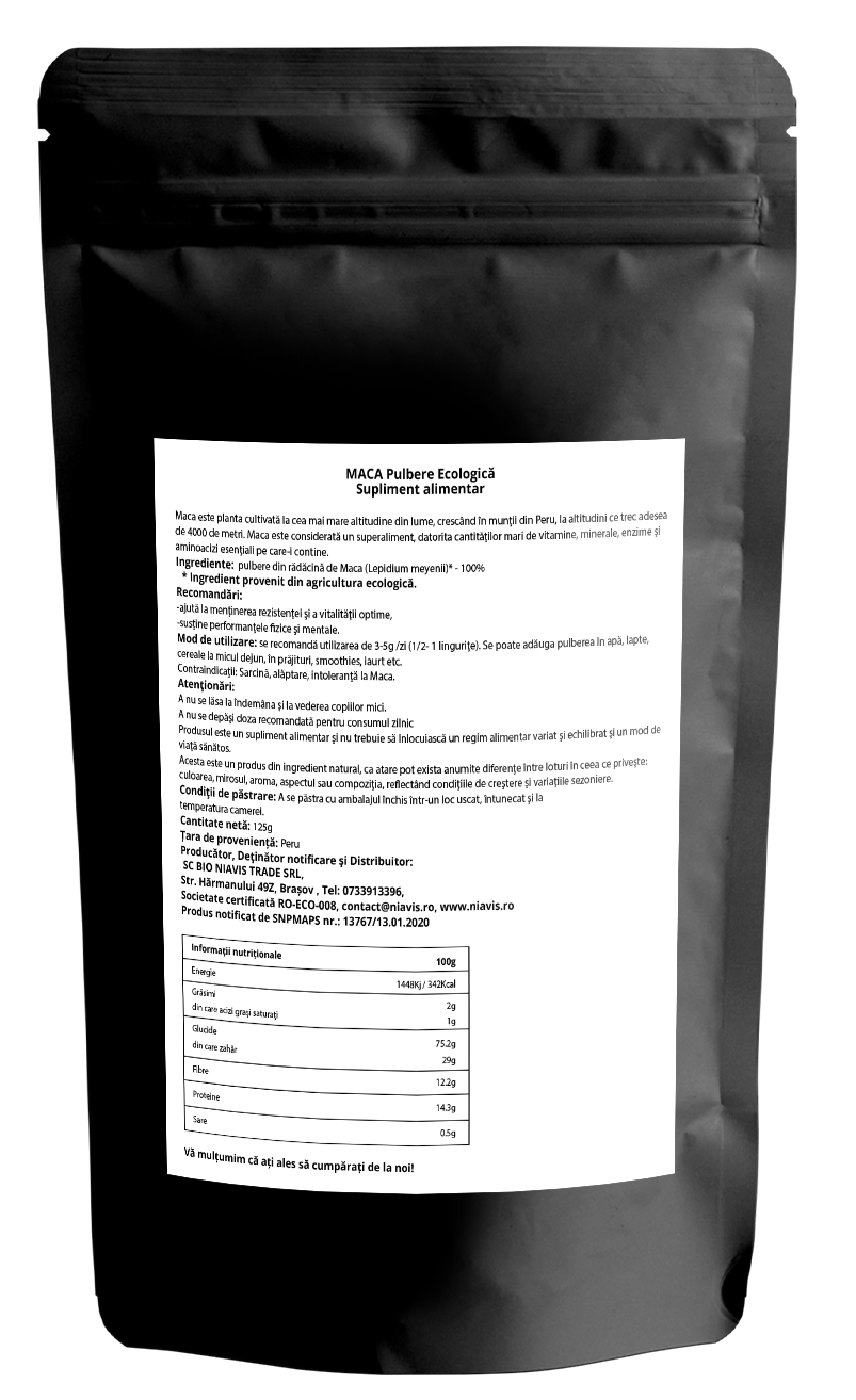 • 100% ecologic: Produsul este realizat din rădăcină de maca cultivată ecologic, fără pesticide sau alte substanțe chimice dăunătoare.