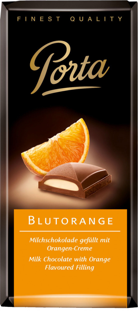 O tabletă de ciocolată cu lapte umplută cu cremă cu aromă de portocală roșie.