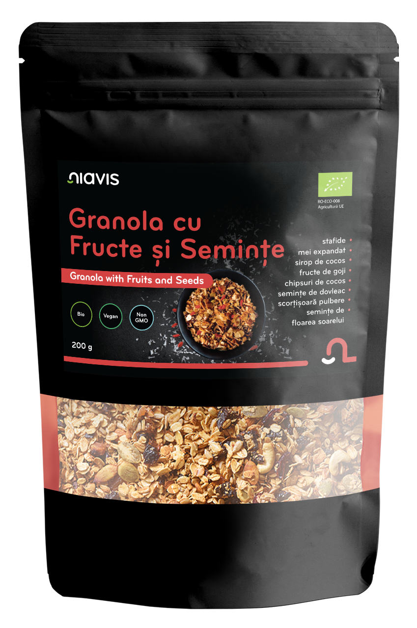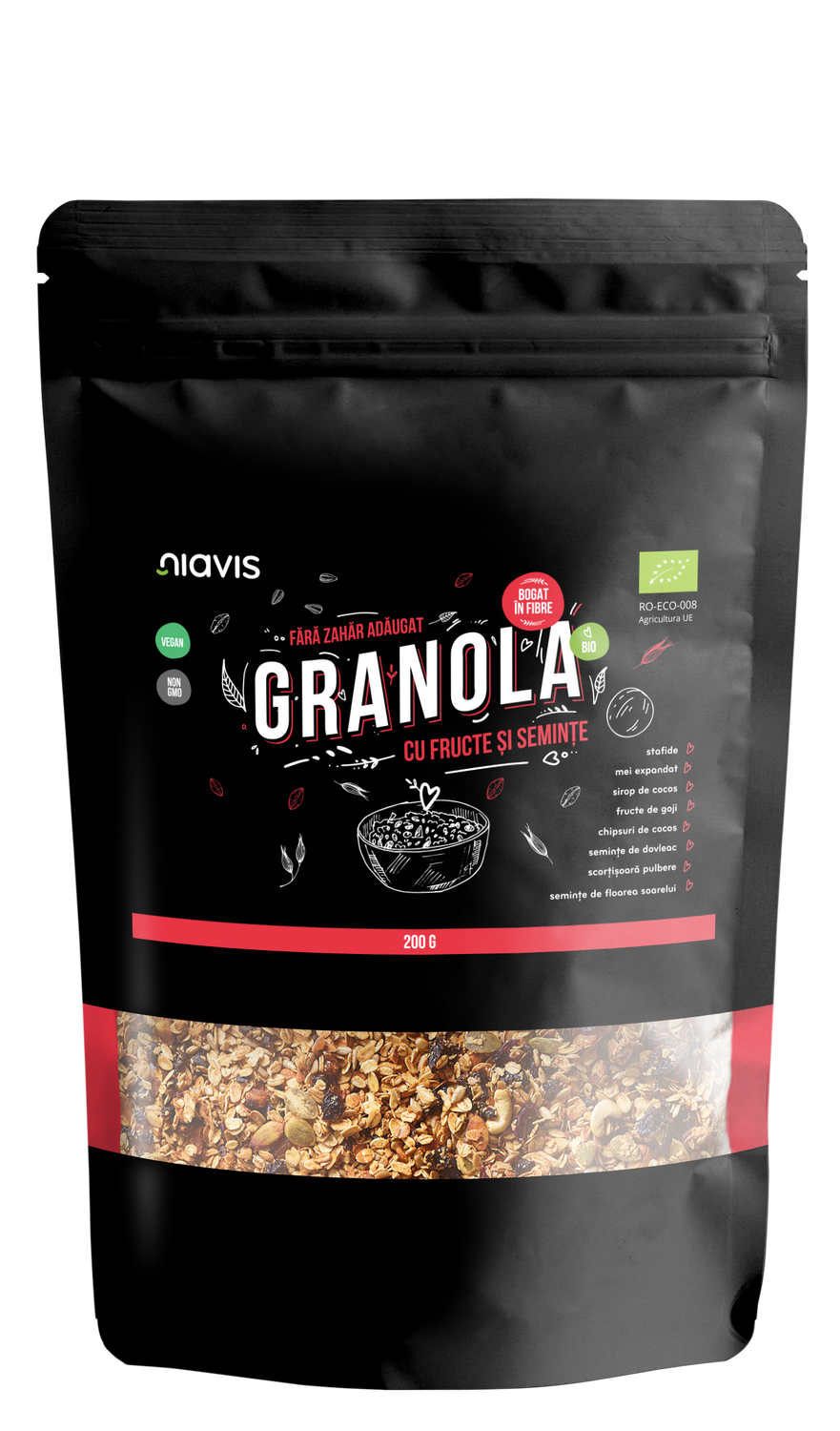 - Ingrediente: 1 cană de granola cu fructe și semințe Niavis, 200ml lapte sau lapte vegetal.