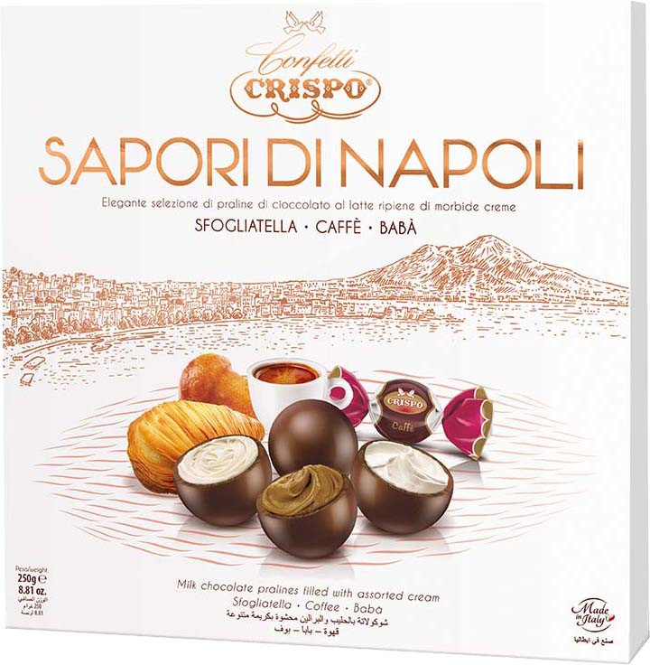 Ingrediente : cremă de cafea (70%) (zahăr, uleiuri vegetale (palmier, rapiță), grăsimi vegetale (grăsimi complet hidrogenate (sâmburi de palmier)), zer pudră (8,8%), lapte praf degresat (7,8%), lapte praf integral (1,3%), emulgator: lecitină din floarea-soarelui; aromă: vanilină), cafea pudră (4%). Cremă babá (prăjitură cu rom) ( 70%) (zahăr, uleiuri vegetale (palmier, rapiță), grăsimi vegetale (grăsimi complet hidrogenate (sâmburi de palmier)), zer pudră (8,8%), lapte praf degresat (7,8%), lapte praf integral (1,3%), emulgator: lecitină din floarea-soarelui; aromă: vanilină, babá, cremă ). Cremă cu aromă de sfogliatella (prăjitură umplută cu ricotta) (70%) (zahăr, uleiuri vegetale (palmier, rapiță), grăsimi vegetale (grăsimi complet hidrogenate (sâmburi de palmier)), zer pudră (8,8%), lapte praf degresat (7,8%), lapte praf integral (1,3%), emulgator: lecitină din floarea-soarelui; aromă: vanilină, sfogliatella). Ciocolată cu lapte (30%) (zahăr, unt de cacao, lapte praf integral , masă de cacao, zer pudră , emulgator: lecitină din soia ; aromă: vanilină). Poate conține urme de gluten , nuci , arahide , ouă , țelină , semințe de susan , muștar , dioxid de sulf , sulfiți și derivații acestora).