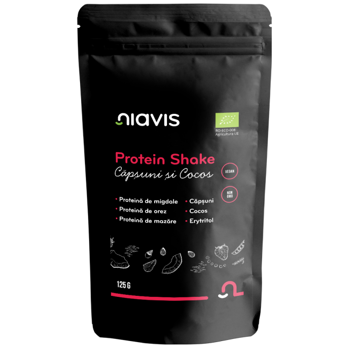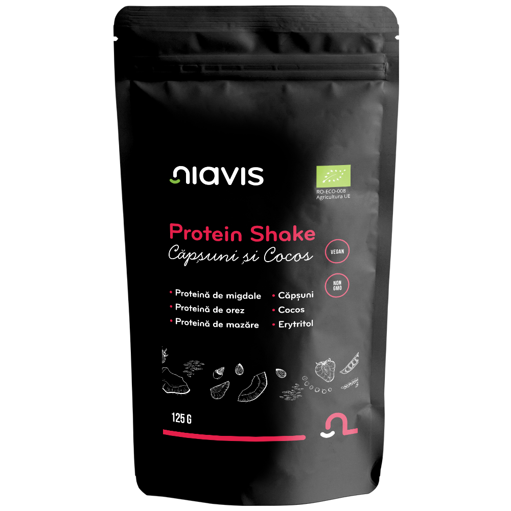 Îmbogățiți-vă dieta cu Protein Shake-ul ecologic de la Niavis, o combinație delicioasă și nutritivă de proteine vegetale, căpșuni și cocos. Acest shake proteic este perfect pentru sportivi, persoane active și pentru toți cei care doresc să își completeze necesarul zilnic de proteine într-un mod sănătos și gustos. Obținut din ingrediente ecologice de înaltă calitate, acest shake oferă o sursă completă de proteine, vitamine și minerale esențiale pentru sănătatea și performanța dumneavoastră.