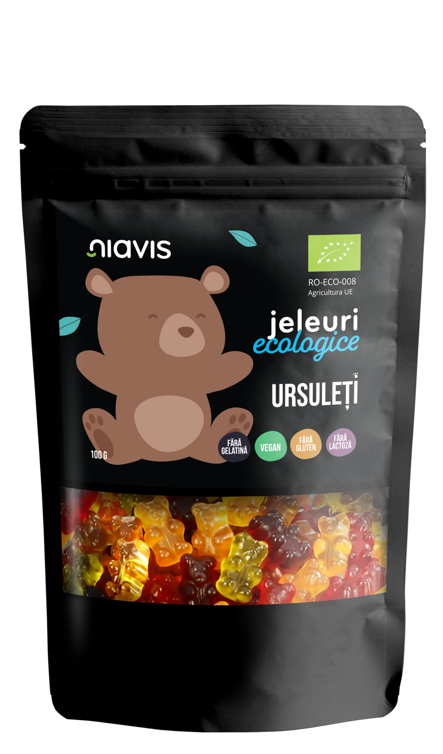 Jeleuri ecologice fara gelatina, sub forma de ursuleti, cu gust de mar, portocala, lamaie, zmeura, coacaze negre sau ananas.
