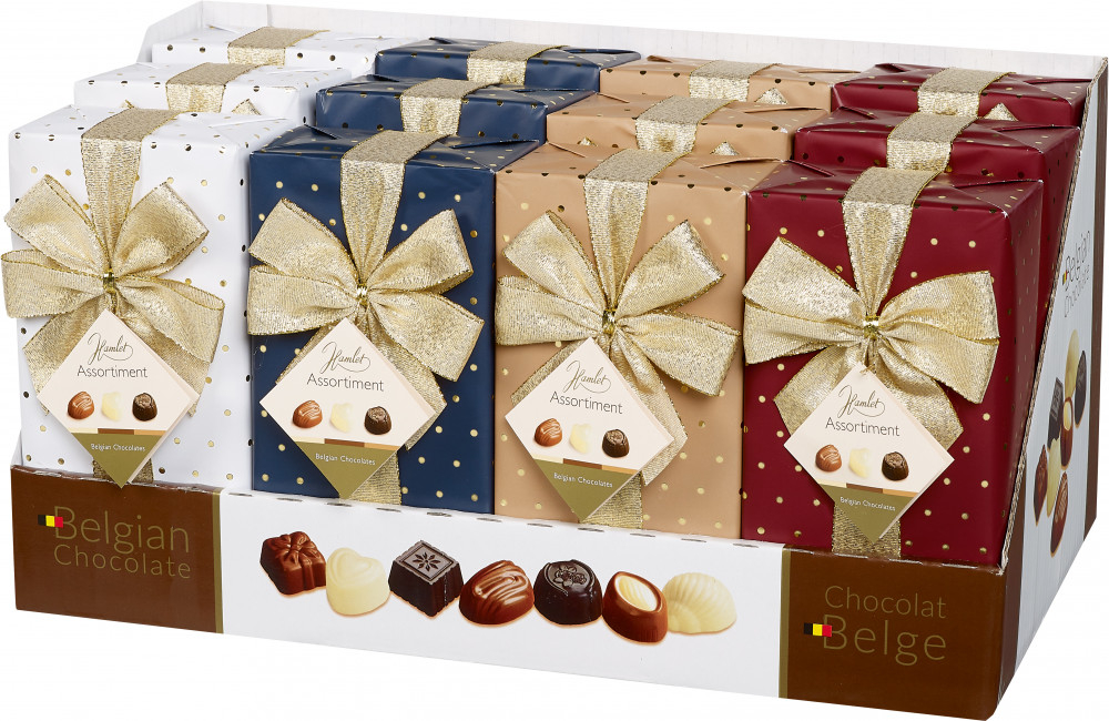 Selecție de ciocolată belgiană umplută cu ciocolată albă, cu lapte și neagră.