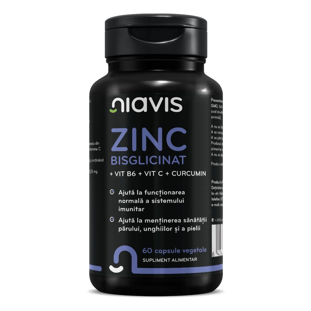 Zinc Bisglicinat + Vitamina B6 + Vitamina C din Acerola + Curcumină Niavis este un supliment vegetal de ultimă generație, conceput pentru a susține sistemul imunitar, a reduce oboseala și a proteja organismul împotriva stresului oxidativ. Formulat din ingrediente naturale, standardizate și ușor absorbabile, acest complex funcționează sinergic pentru a oferi sprijin în perioadele de vulnerabilitate, tranziții de sezon, recuperare sau efort susținut.