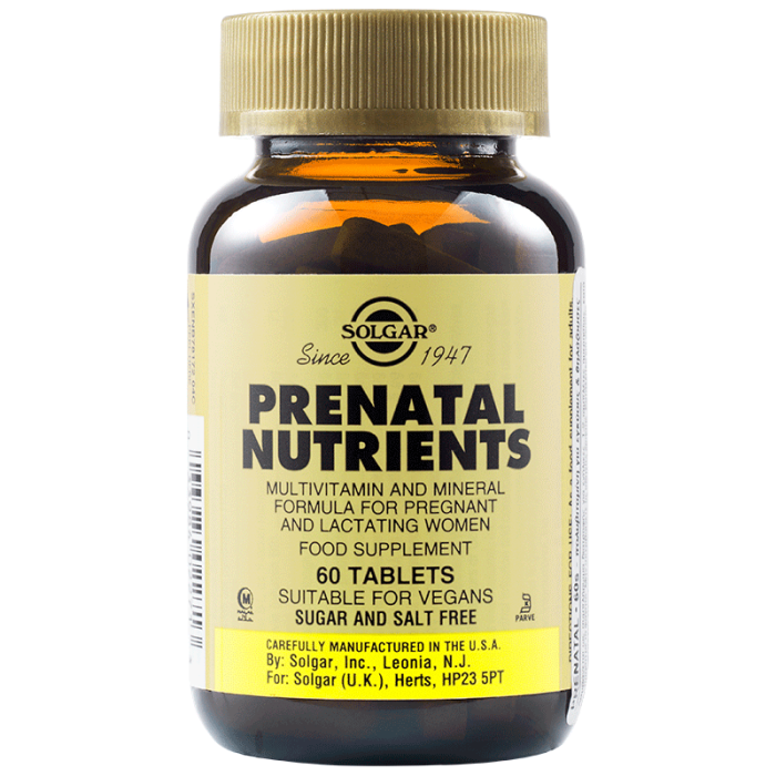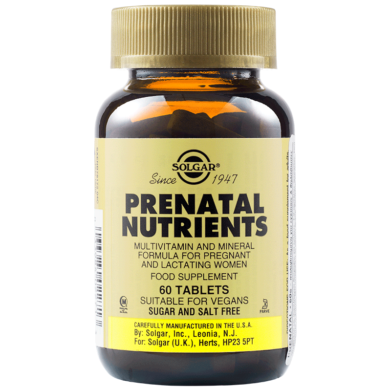 Solgar® Prenatal Nutrients este o formulă unică, brevetată, ce asigură 100% din valoarea zilnică recomandată a majorității vitaminelor și mineralelor esențiale pentru femeile însărcinate sau care se află în perioada alăptării.