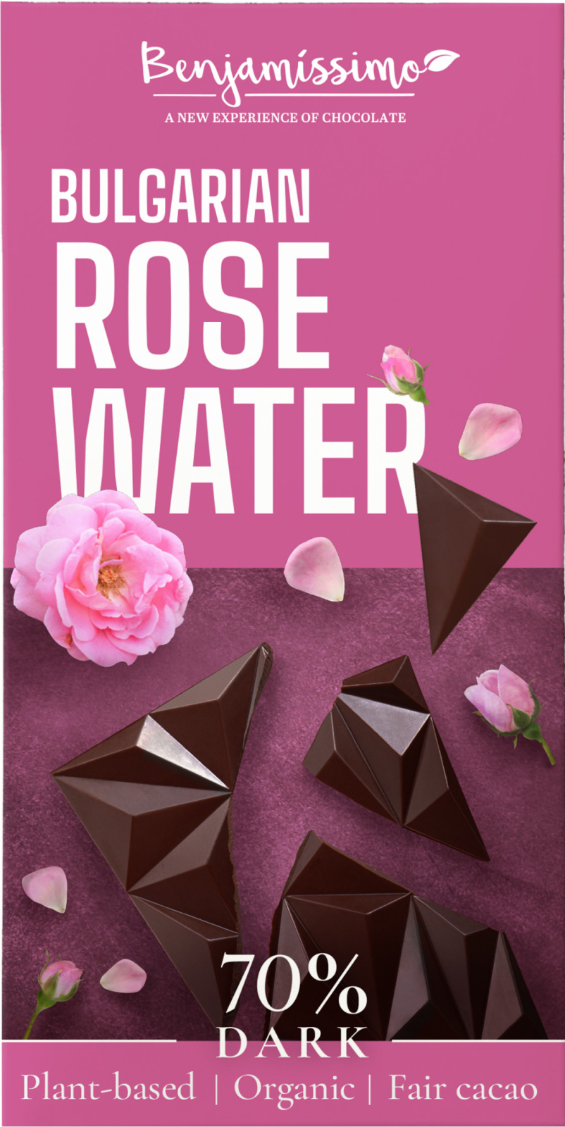 Ciocolata Neagra 70% Cu Apa De Trandafiri Bulgaresti Bio : Produsele Benjamissimo nu conțin lactoză, gluten și soia și pot fi consumate de vegetarieni și vegani. Sunt făcute din ingrediente 100% naturale, din boabe de cacao de cea mai bună calitate, pentru a oferi un moment de răsfăț.
