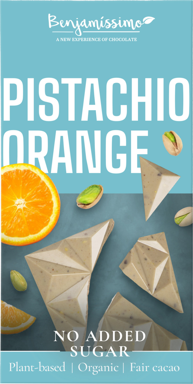 BIO Ciocolată albă fără zahăr adăugat cu fistic și tahini, ulei de portocale și îndulcitor.