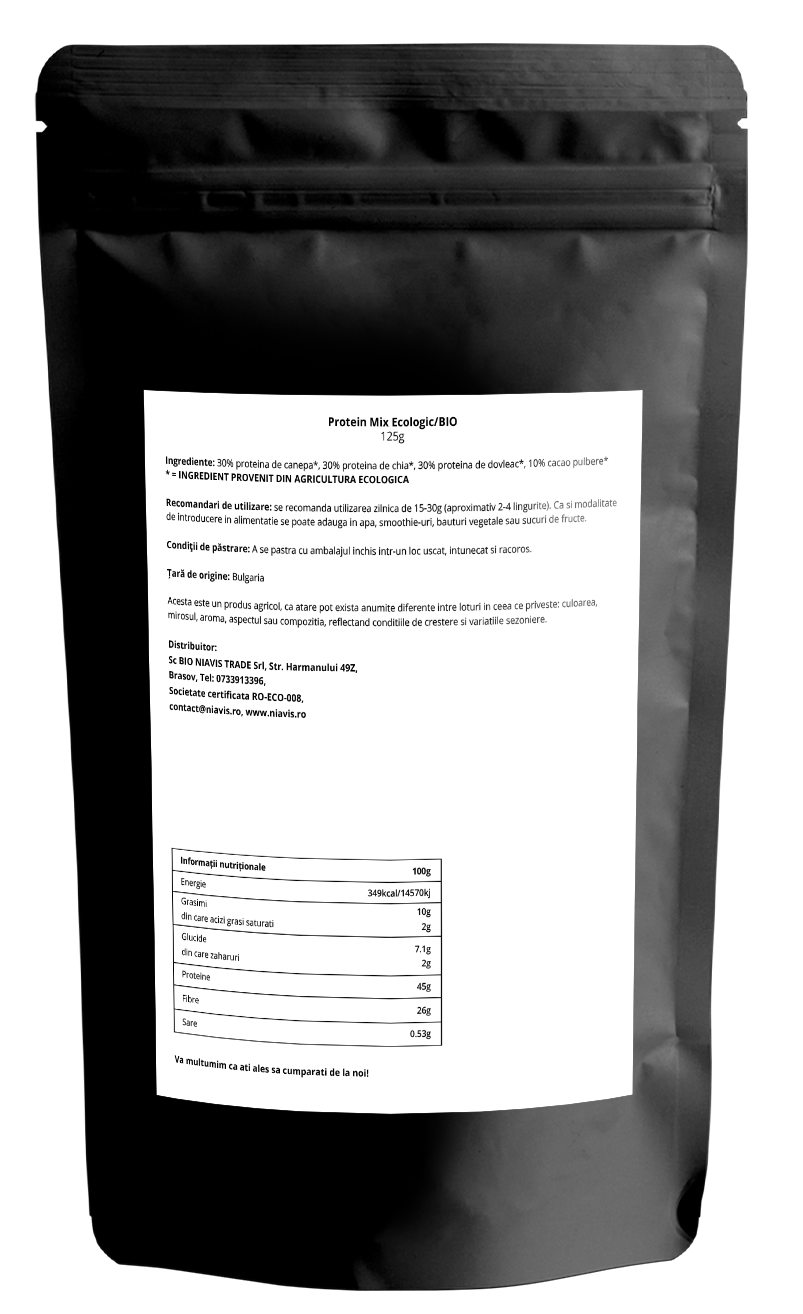 Ingrediente: 30% proteina de canepa*, 30% proteina de chia*, 30% proteina de dovleac*, 10% cacao pulbere*